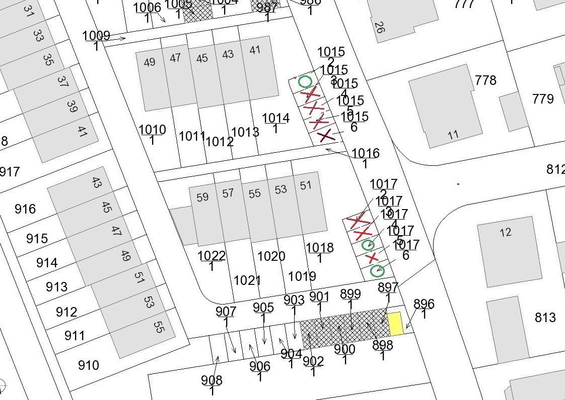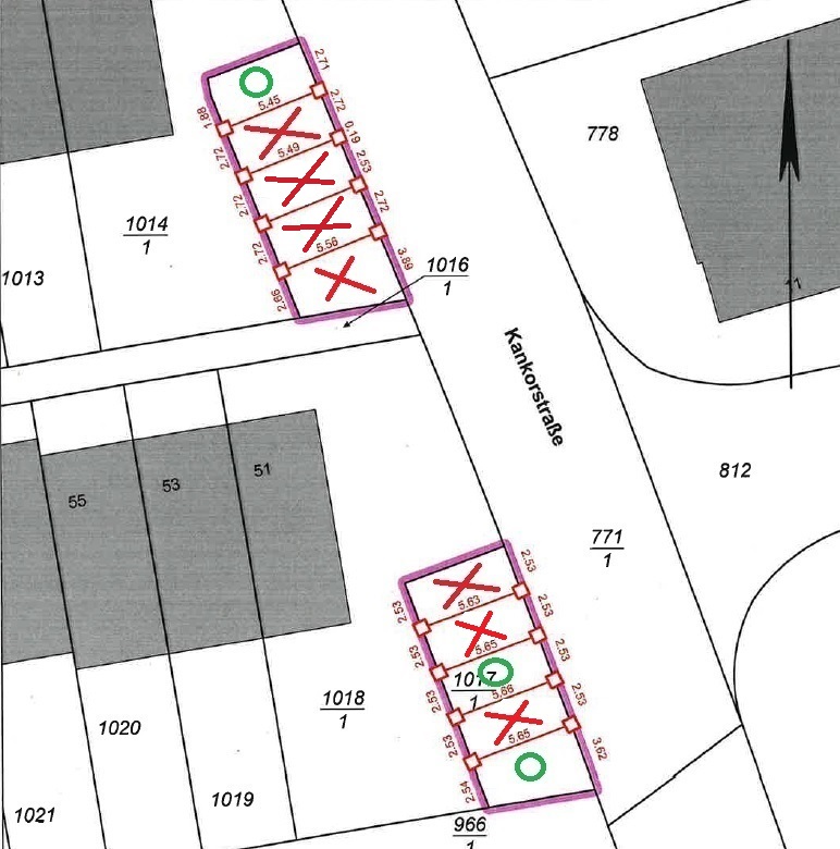 Zum Verkauf stehen vier Stellplätze mit jeweils 14 m² in der Kankorstraße. Der Kaufpreis wurde auf 8.500,- € pro Stellplatz festgelegt.